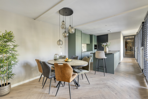 De keuken in U-opstelling sluit naadloos aan op het woongedeelte en is van alle gemakken voorzien. Er is veel werkblad en kastruimte, en moderne inbouwapparatuur zoals een koel-vriescombinatie, combi-oven-magnetron, inductiekookplaat, afzuigkap en vaatwasser. Dankzij de ruime opzet is er plek voor een grote eettafel met zes tot acht stoelen, ideaal om samen uitgebreid te tafelen met familie en vrienden of een gezellig spelletjesavond te organiseren.
