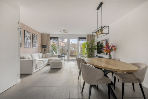 De woonkamer en leefkeuken beslaan samen bijna 60 m² en vormen het kloppende hart van het appartement. Dankzij de grote ramen op het zuidwesten baadt de ruimte de hele dag in het licht en voelt het heerlijk ruim aan. De lage borstwering zorgt ervoor dat je, zelfs als je lekker op de bank zit, vrij wegkijkt over het aangrenzende park. Het zitgedeelte biedt ruimte genoeg voor een grote hoekbank én een royaal tv-meubel, zonder dat het krap aanvoelt. Zo creëer je een plek waar je heerlijk kunt ontspannen, tv kijken of een boek lezen met uitzicht op het groen.